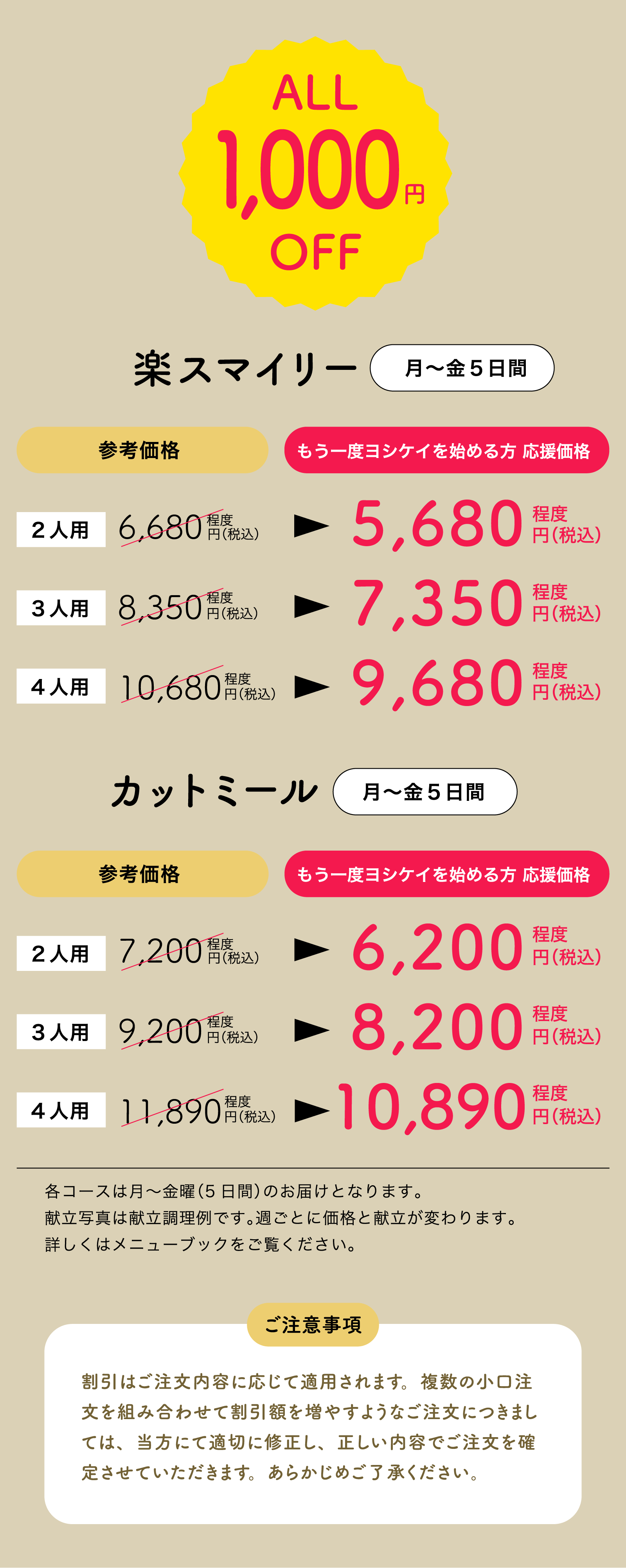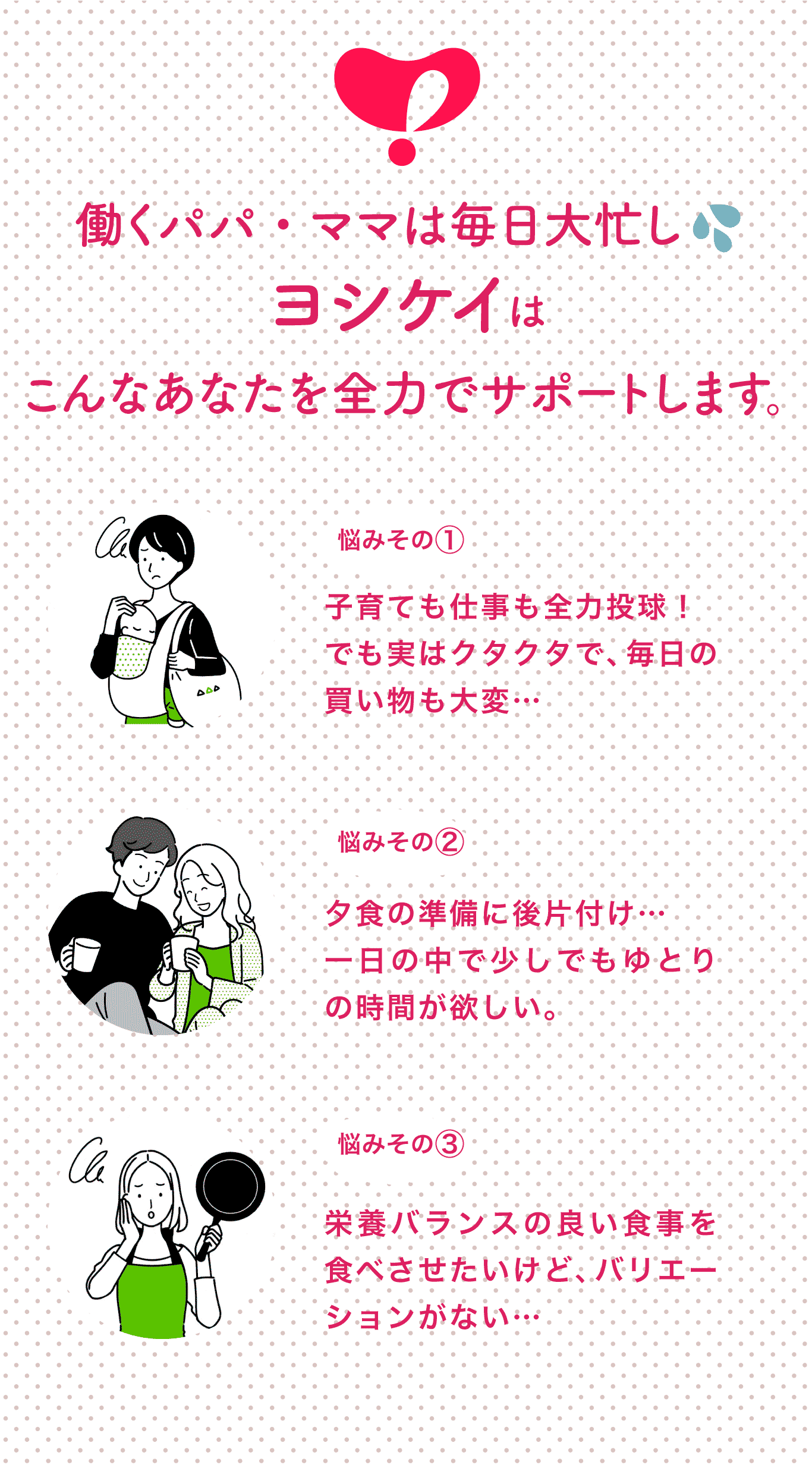 ヨシケイは会員制ではありません。どなたでも必要なときだけご利用頂けます。お試し後の送料もずっと無料。まずはお気軽にお試し下さい。